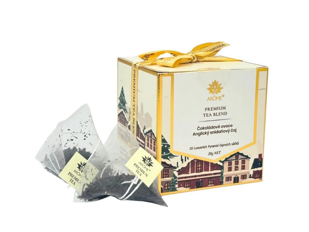 Luxusní čajová dárková krabička ARÔME obsahující 10 pyramidových sáčků: 5× „Čokoládové ovoce“ a 5× klasický „Anglický snídaňový čaj“