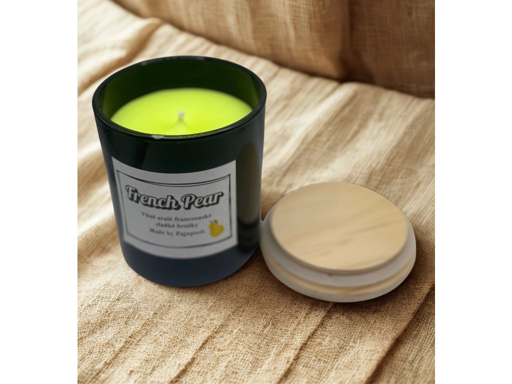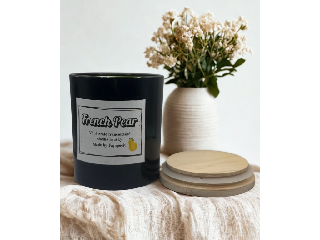 Ručně vyráběná svíčka FajnPocit – French Pear ve skle s dřevěným víčkem. Jemná vůně francouzské hrušky s vanilkou a květinovými tóny pro harmonickou atmosféru.