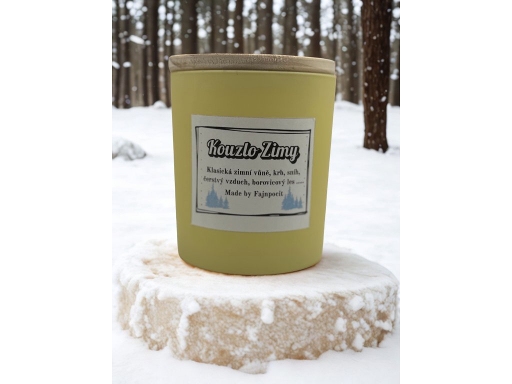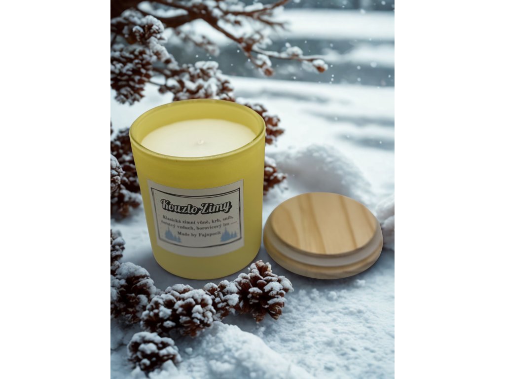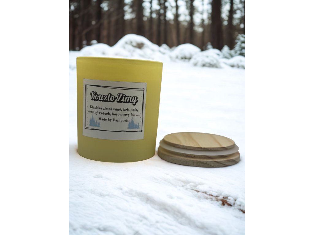 Ručně vyráběná svíčka FajnPocit – Kouzlo zimy ve skle s dřevěným víčkem. Vůně s tóny jehličí, dřeva a koření pro hřejivou zimní atmosféru.